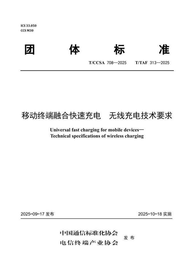 来源:环球网 近日,国内终端充电领域迎来重要突破,由广东省终端快充行业协会深度参与、中国通信标准化协会 (CCSA)与电信终端产业协会(TAF)联合制定,中国信息通信研究院及国内头部终端、芯片企业共 同起草的T/CCSA708-2025(T/TAF313—2025)《移动终端融合快速充电 无线充电技术要求》团体标准 正式发布。 作为国内首个支持高功率融合快速充电技术的无线快充标准,该标准的出台填补了我国在移动终端融合 无线充电技术标准领域的空白,为行业搭建了融合统一的技术框架,从根本上为解决协议碎片化问题提 供了依据。 无线快充现状:便捷性凸显,协议碎片化成瓶颈 近年来,我国终端充电技术迭代速度持续加快,充电速度从早期的5W逐步提升至百瓦级,充电安全防 护体系不断完善,智能功率调节、低温充电优化等技术也开始广泛应用。其中,无线充电凭借无需物理 连接、随放随充的便捷性,以及适配多设备的灵活性,迅速成为消费电子、移动通信、新能源汽车等领 域的热门技术。 然而,在产业快速发展的背后,无线快充协议碎片化问题却日益凸显。目前市场上主流的高功率无线快 充协议分属不同厂商,技术参数、通信逻辑存在差异,导致消费者使用不同品牌 ...