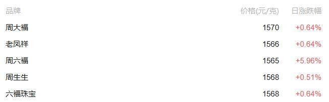 | 品牌 | 价格(元/克) | 日涨跌幅 | | --- | --- | --- | | 周大福 | 1570 | +0.64% | | 老凤祥 | 1566 | +0.64% | | 周六福 | 1565 | +5.96% | | 周生生 | 1568 | +0.51% | | 六福珠宝 | 1568 | +0.64% | 近期,多家黄金品牌均传出即将涨价消息。例如,周大福被曝即将启动春节后新一轮涨价,涨价重点集 中在一口价产品,预计涨幅15%~30%,部分产品的涨幅将超过30%。 此外,今年1月,周生生、潮宏基等品牌亦对旗下多款一口价饰品启动调价。宝兰、琳朝分别于1月底和 2月初完成涨价,老铺黄金则将在2月28日启动2026年首次调价。 25日亚洲交易时段,纽约白银期货价格延续前一日涨势,盘中一度涨超2%。银价上涨的背后,除工业 需求支撑外,纽约商品交易所库存不断下滑、近月合约未平仓数量较高等因素都让投资者继续押注白银 供应吃紧。 此外,有关美国白宫方面正在筹划通过行政渠道,将美国对全球关税税率上调至15%的消息,推动市场 避险情绪升温,国际金价也止跌回升。 截至北京时间10时48分,纽约商品交易所3月 ...