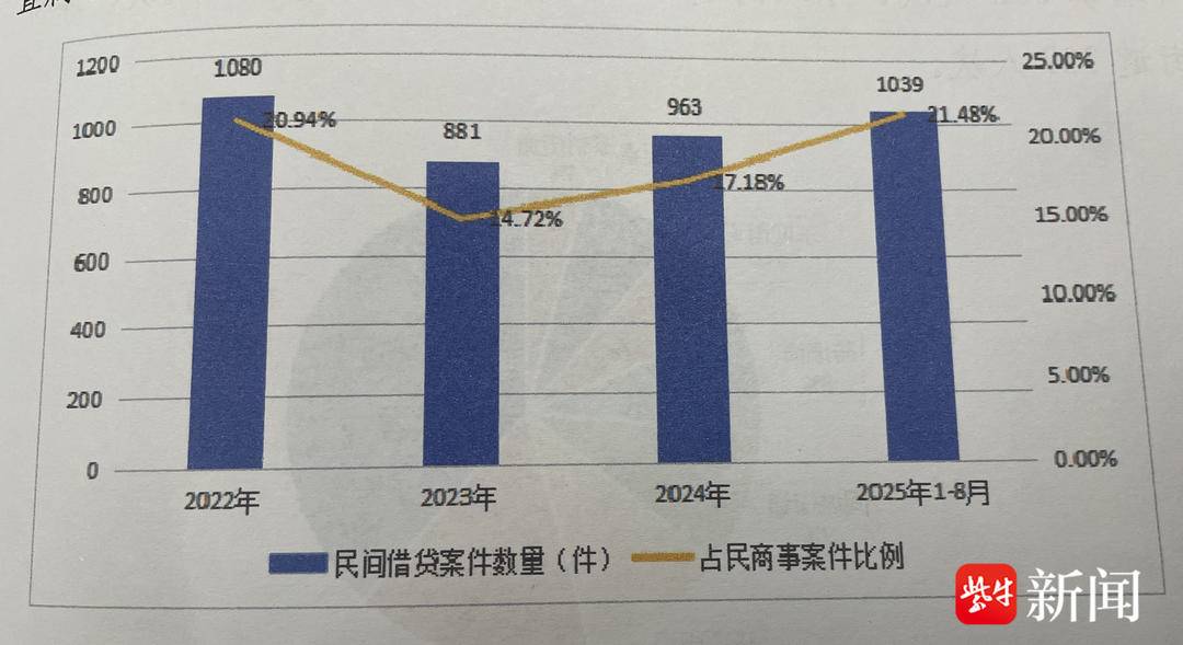 随着经济快速发展,民间借贷活动日益频繁,相关纠纷发生率也呈增势。10月29日,南京市高淳区人民法院召开新闻发布会,发布民间借贷纠纷审判白皮 书。2022年1月至2025年8月,该院共审理民间借贷案件3000多件,针对审理过程中发现的新趋势、新问题,该院在白皮书中给出了风险防范提示。 阳江法庭副庭长段云婷介绍,在高淳法院审理的民间借贷案件中,存在套取金融机构贷款转贷、"砍头息"导致复杂计算,刑民交叉问题时有发生等难点。 近三年数量逐年增长,今年前8月受案超千件 近三年来,民间借贷案件一直是高淳法院受理民商事案件中数量最多的案由之一,且案件数量、涉案金额从2023年逐年快速持续增长。2025年1-8月,该 院已受理民间借贷案件1039件,占同期民商事案件比例21.48%,涉案金额约为5.11亿元。 在随白皮书发布的典型案例中,就有一件"砍头息"相关案例。张某向李某借款10万元,李某通过银行转账交付款项。当日,张某向李某微信转账2000元用 于支付"第一个月的利息"。后张某未能按约还款,李某向法院起诉,要求对方返还借款本金10万元及相应利息。该院经审理认为,张某在借款当日支付的 2000元属于"砍头息",借款本金应 ...