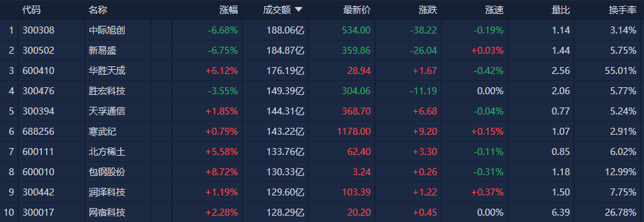 2月27日,A股三大指数涨跌不一,截至收盘,上证指数涨0.39%,深成指跌0.06%,创业板指跌1.04%。 此外,钢铁、煤炭、培育钻石盘中均有拉升。 下跌方面,造纸、PCB、CPO、存储芯片、工程机械、机场航运板块跌幅居前。 全市场个股涨多跌少,超3200只个股上涨。 板块题材上,稀土、有色金属、小金属、电力、煤炭、钢铁、燃气、算力租赁、光伏设备、培育钻石、教育、多元金融板块涨幅居 前。 盘面上,稀土和小金属价格近段时间持续上涨,相关板块今日再度大涨,章源钨业、云南锗业、翔鹭钨业、北方稀土多股创出历史 新高。 电力股午后持续走强,珈伟新能收获20cm涨停,涪陵电力、闽东电力等近10股同样封板。 算力租赁板块同样表现积极,云天励飞、拓维信息等股涨停。 PCB、CPO等算力硬件股回调,新易盛、中际旭创、源杰科技多股盘中跌超5%。 全市场成交金额超2.5万亿元。 个股方面,据南财金融终端数据显示,全天成交额最高的是中际旭创,达188.06亿元。新易盛、华胜天成、胜宏科技、天孚通信等 个股成交额靠前。 (文章来源:21世纪经济报道) | 代码 | 名称 | 涨幅 | 成交额▼ | 最新价 | | | | 换手率 | ...