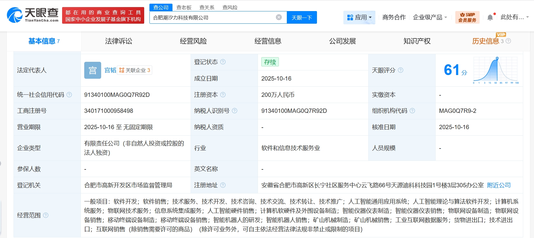 Group 1 - Hefei Tidal Force Technology Co., Ltd. has been established with a registered capital of 2 million RMB, focusing on artificial intelligence applications and related services [1][2] - The company is wholly owned by Zhejiang Tidal Force Technology Co., Ltd., a subsidiary of iFlytek [1][2] - The business scope includes AI software development, IoT technology services, and manufacturing of intelligent instruments and hardware [1][2] Group 2 - The company is classified as a limited liability company and operates in the software and information technology services industry [2] - The registration was completed on October 16, 2025, and the company is currently in a state of existence [2] - The registered address is located in the High-tech Zone of Hefei, Anhui Province [2]