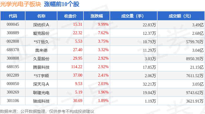 证券之星消息,10月23日光学光电子板块较上一交易日上涨0.25%,深纺织A领涨。当日上证指数报收 于3922.41,上涨0.22%。深证成指报收于13025.45,上涨0.22%。光学光电子板块个股涨跌见下表: 从资金流向上来看,当日光学光电子板块主力资金净流出5.12亿元,游资资金净流入1482.99万元,散户 资金净流入4.98亿元。光学光电子板块个股资金流向见下表: | 代码 | 名称 | 主力净流入(元) | 主力净占比 游资净流入(元) | | 游资净占比 散户净流入 (元) | | 散户净占比 | | --- | --- | --- | --- | --- | --- | --- | --- | | 688195 腾景科技 | | 1.22亿 | 5.79% | -6349.78万 | -3.00% | -5893.64万 | -2.79% | | 000100 TCL科技 | | 1.11亿 | 9.26% | -5829.33万 | -4.88% | -5224.03万 | -4.38% | | 000045 深纺织A | | 7945.73万 | 22.75% | -4591.65万 | ...
