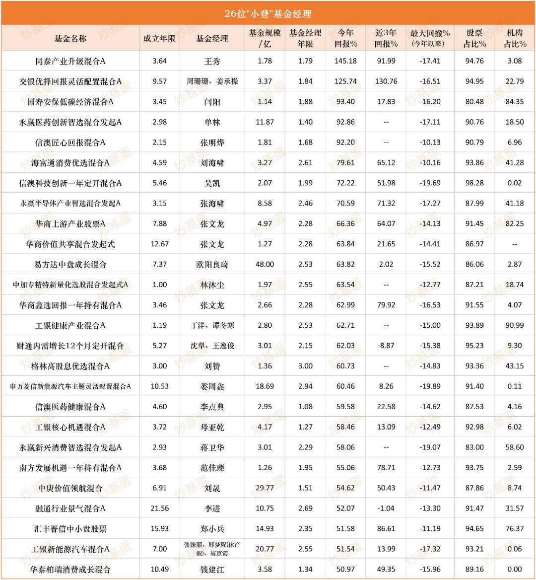 最近的市场依旧很是复杂,大盘继续创下新高。热点上一天科技、一天红利轮动。科技属性的创新药、新能源走势强劲。市场不像之前有明确的主线,各 个小热点纷至沓来。 最近,"老登股""小登股"讨论火热,前者就是传统的行业,后者是科技成长企业。从这个思路出发,以年龄为区分,找了一些"小登基金经理"和"老登基 金经理"。 首先明确一下,从主动权益基金里筛选,限定在主动权益基金:普通股票、偏股混合、灵活配置,且股票仓位>50%。多位基金经理,以第一位数据计 算。 那么下面筛选"小登基金经理": 管理基金年限1~3年 基金成立时间>1年、基金规模>1亿 今涨幅>50%,最大回撤20%以内 剔除C类 共计筛选出26个,如下: | | | | 26位"小登"基金经理 | | | | | | | | --- | --- | --- | --- | --- | --- | --- | --- | --- | --- | | 2017 基金名称 | 成立年限 | 基金经理 | 基金规模 | 基金经理 | 今年 | 近3年 | 最大回撤% | 股票 | 机构 | | | | | 112 | 年限 | 回报% | 回报% | (今年以来) ...