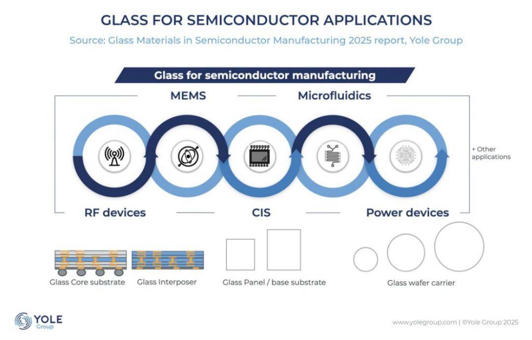 Group 1 - The core viewpoint is that glass is transitioning from a niche material to a strategic material in the semiconductor industry, with applications expected to grow nearly threefold by 2030 [1][2][5] - Glass is becoming a core material for both temporary and permanent functions in semiconductor manufacturing, with carrier wafers being the largest revenue source [2][5] - The demand for glass is projected to grow at a compound annual growth rate (CAGR) of 10.2% from 2025 to 2030, driven by the increasing complexity of packaging processes transitioning from 2D to 3D [2][5] Group 2 - By 2030, glass material revenue is expected to grow at a CAGR of 9.8%, solidifying its position as a mainstream semiconductor processing platform [5] - The most dynamic sector for glass is the CIS field, which is anticipated to account for two-thirds of total glass revenue by 2025, driven by high demand in smartphone and automotive imaging applications [5] - The memory segment is projected to have the highest growth potential, with a CAGR of 33% from 2025 to 2030, particularly in HBM applications [5][6] Group 3 - The glass supply chain is expected to evolve similarly to the IC substrate industry by 2030, characterized by regional redundancy and detailed specification requirements [9] - Major companies like AGC, PlanOptik, Corning, and Schott are projected to account for about 90% of global revenue by 2025, indicating high market concentration [9] - The transition in the glass supply chain will provide competitive advantages to companies that master capacity and reuse strategies [9] Group 4 - Glass substrates are being developed to replace traditional PCB materials, enhancing power efficiency and thermal resistance, with significant advantages in reducing warpage [10] - South Korean companies, including Samsung, SK, and LG, are actively pursuing the commercialization of glass substrates to expand their market presence in next-generation semiconductor applications [10]