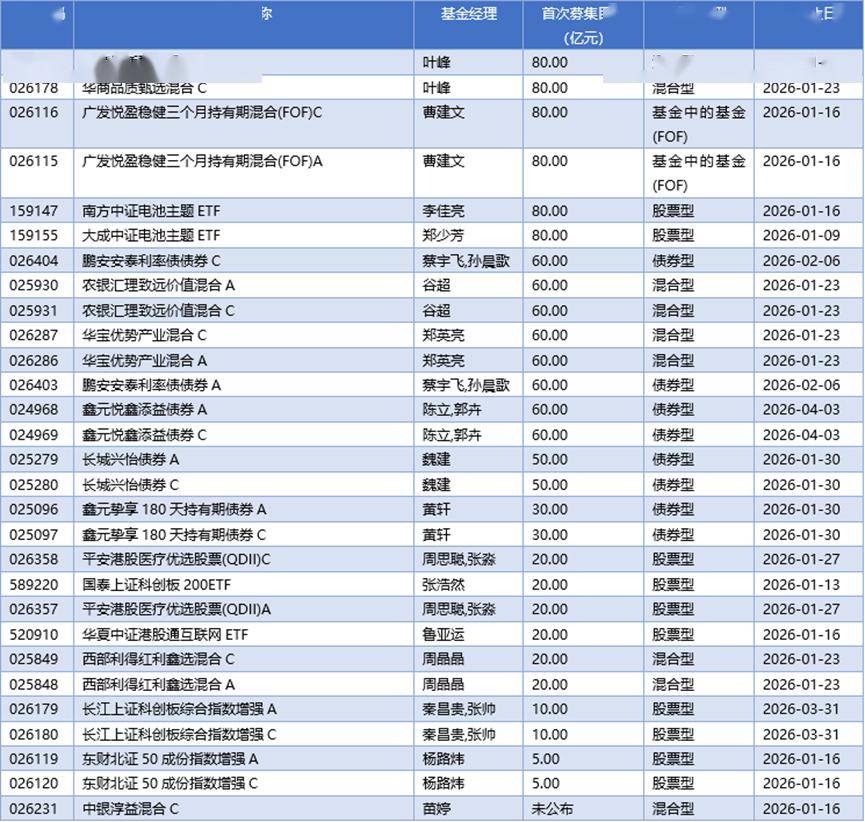 一、交易提示 2025年行情收官,上证指数突破4000点创十年新高,人工智能、半导体等硬科技板块贯穿全年,A股市值首破100万亿元。 结构性牛市推动下,主动权益基金批量造牛:全年75只产品净值翻倍,含"科"量高的科技成长基金占据主流。业绩与估值 共振是"翻倍基"密集诞生的核心逻辑,也为2026年盈利驱动行情奠定预期基础。 (4)2025年公募榜单揭晓,永赢科技智选以233.29%的年度收益夺冠,并刷新国内主动权益基金年度收益纪录。全年共有 75只产品净值翻倍,重仓股含"科"量高企;反观押注传统周期、金融、消费的基金,部分年内亏损,首尾业绩差距超过250 个百分点。业内人士指出,2026年市场风格或趋于均衡,盈利修复将成为核心变量,权益投资分化料进一步加剧,精选个 股与行业配置能力将成为决胜关键。 三、01月05日新发基金一览(不包含传统封闭式基金) | T | R | 電影經 | 首次募集团 | B | 原日 | | --- | --- | --- | --- | --- | --- | | | | | (亿元) | | | | | | 叶隆 | 80.00 | 1 | - | | 026178 | 2 4 ...