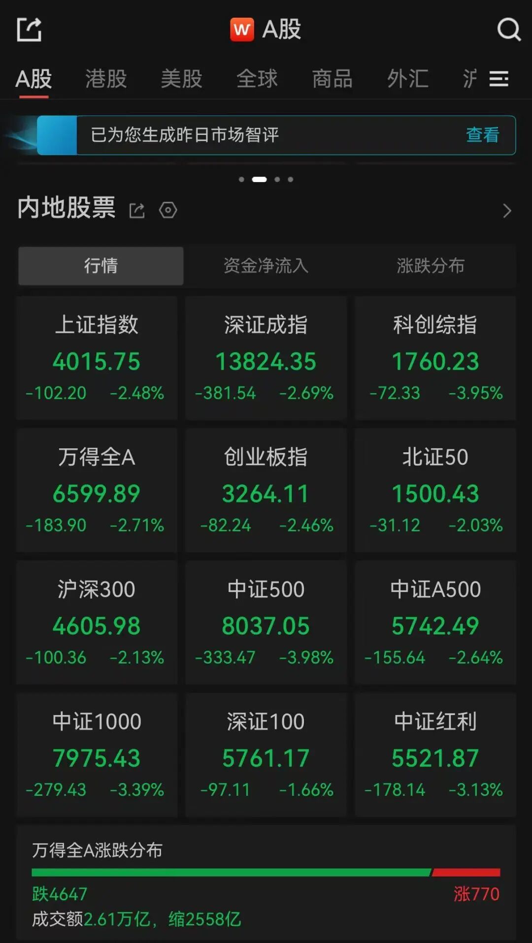 | L | | w A股 | | | | --- | --- | --- | --- | --- | | A股 港股 美股 | 全球 商品 | | 外汇 | 汁 三 | | 已为您生成昨日市场智评 | | | 查看 | | | 内地股票 △ ⊙ | | | | | | 行情 | 资金净流入 | | 涨跌分布 | | | 上证指数 | 深证成指 | | 科创综指 | | | 4063.54 | 14006.25 | | 1790.74 | | | -54.41 -1.32% | -199.65 -1.41% -41.82 -2.28% | | | | | 万得全A | 创业板指 | | 北证50 | | | 6690.89 | 3306.94 | | 1514.43 | | | -92.90 -1.37% | -39.41 -1.18% -17.12 -1.12% | | | | | 沪深300 | 中证500 | | 中证A500 | | | 4656.16 | 8179.80 | | 5815.10 | | | -50.18 -1.07% -190.72 -2.28% | | | -83.02 -1.41% ...