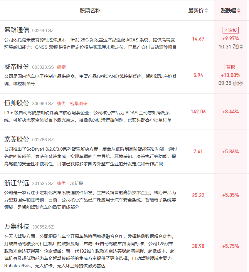 一、行情表现 1月15日,无人驾驶板块逆势走强。威帝股份、索菱股份(炸)、锦江在线(炸)、浙江世宝(炸)等涨停,恒帅股份、 亚太股份、高新兴、万集科技等早盘集体走强。 从行业发展看,预计2030年L2级自动驾驶渗透率达90%,L3级达3.4%,智能底盘市场规模将达1078.6亿元,2024-2030年 复合增速24.5%。产业链方面,感知层的激光雷达、毫米波雷达,决策层的智驾芯片,执行层的线控转向、线控制动等 环节将充分受益,相关企业订单与业绩有望持续释放(国泰海通证券)。 2)智能驾驶产业链已形成"感知-计算-执行-整车-运营"闭环协同,技术路线向多传感器融合与软件驱动迭代。随着政策 开放与技术成熟,自动驾驶渗透率将快速提升,带动单车价值量与关键零部件市场扩容。 全球ADAS市场规模预计从2024年346.5亿美元增长至2030年665.6亿美元,年化增长率12.2%;汽车传感器市场将从2023 年308亿美元增长至2028年622亿美元。国内供应链在感知硬件、域控平台等领域快速补齐,与国际Tier1形成竞争,相关 企业有望借助国产化替代与规模化效应实现业绩增长(德邦证券)。 | 股票名称 | 最新价专 | ...