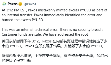 Core Insights - A significant operational error by Paxos led to the minting of 300 trillion PYUSD stablecoins, which were subsequently sent to an inaccessible wallet for destruction, marking an unprecedented event in the cryptocurrency market [1][2][11]. Group 1: Incident Overview - On October 15, Paxos mistakenly minted 300 trillion PYUSD stablecoins, which is equivalent to approximately 300 trillion USD based on its dollar peg [1][2]. - This amount exceeds twice the total GDP of all countries globally, according to the International Monetary Fund [2]. - The incident is described as a typical "fat finger" mistake, highlighting the potential for human error in digital asset management [9]. Group 2: Market Reaction - Following the incident, Aave's founder announced a temporary freeze on PYUSD trading due to the unexpected high-volume transaction [3]. - Despite the massive minting error, PYUSD maintained its dollar peg, with only a brief price drop of about 0.5% [6]. Group 3: Company Response - Paxos stated that the excessive minting was due to an internal technical error during a transfer process and confirmed that customer funds remain secure [4]. - The company has addressed the root cause of the error, ensuring that such incidents do not recur [4]. Group 4: Market Position - Currently, PYUSD has a market capitalization exceeding 2.3 billion USD, ranking sixth among stablecoins, following Tether's USDt, USDC, Ethena USDe, Dai, and World Liberty Financial USD [8]. Group 5: Implications and Concerns - The incident raised critical questions regarding the collateral mechanisms of stablecoins, with concerns about what backed the erroneously minted 300 trillion USD [14][15].