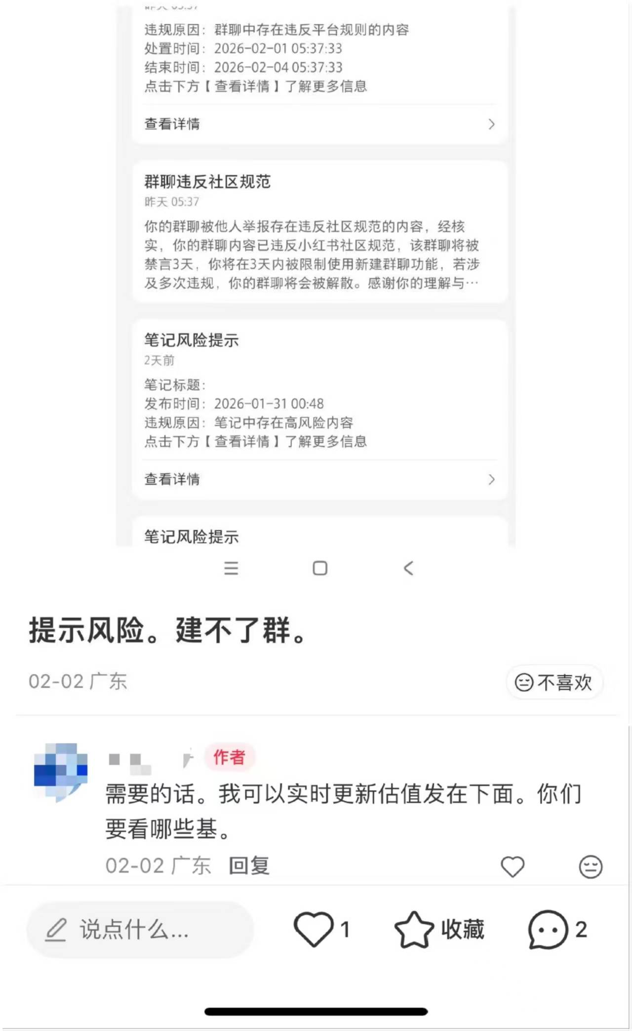 深圳商报·读创客户端记者 詹钰叶 在多平台下架"基金实时估值"相关功能后,不少博主在小红书等社交平台分享可进行实时估值的小程序或是软件。不过,最近小红书已关注到这一现象,部 分账号因此被禁言、相关笔记被删除。记者注意到,有被禁言账号转战微信公众号,也有博主转向小红书群聊分享。不过已有博主称被举报后禁止使用群聊 部分功能。 不久前监管机构发布的2026年第1期机构监管情况通报提到,日常监管关注到部分基金销售机构和非持牌的第三方平台重新上架"基金实时估值"功能,直接 提供或通过"净值参考""板块涨跌"等形式变相提供"基金实时估值"功能,同时还衍生出按平台当日申购金额排序的"加仓榜"、展示用户持仓收益和明细的"实 盘榜"等。上述功能可能误导投资者,摊薄基金产品收益,引发投诉纠纷,应当予以规制。并指出基金销售机构及第三方网络平台要加强自查自纠,按期下 架"基金实时估值""加仓榜""实盘榜"等功能,杜绝误导投资者的行为。 应监管要求,多平台于月初下架"基金实时估值"相关功能,随后小红书平台多个笔记显示,大量账号分享了自制的实时估值小程序或软件。不过最近几日小 红书禁言了多个分享基金实时估值工具的博主。记者注意到,上周发 ...