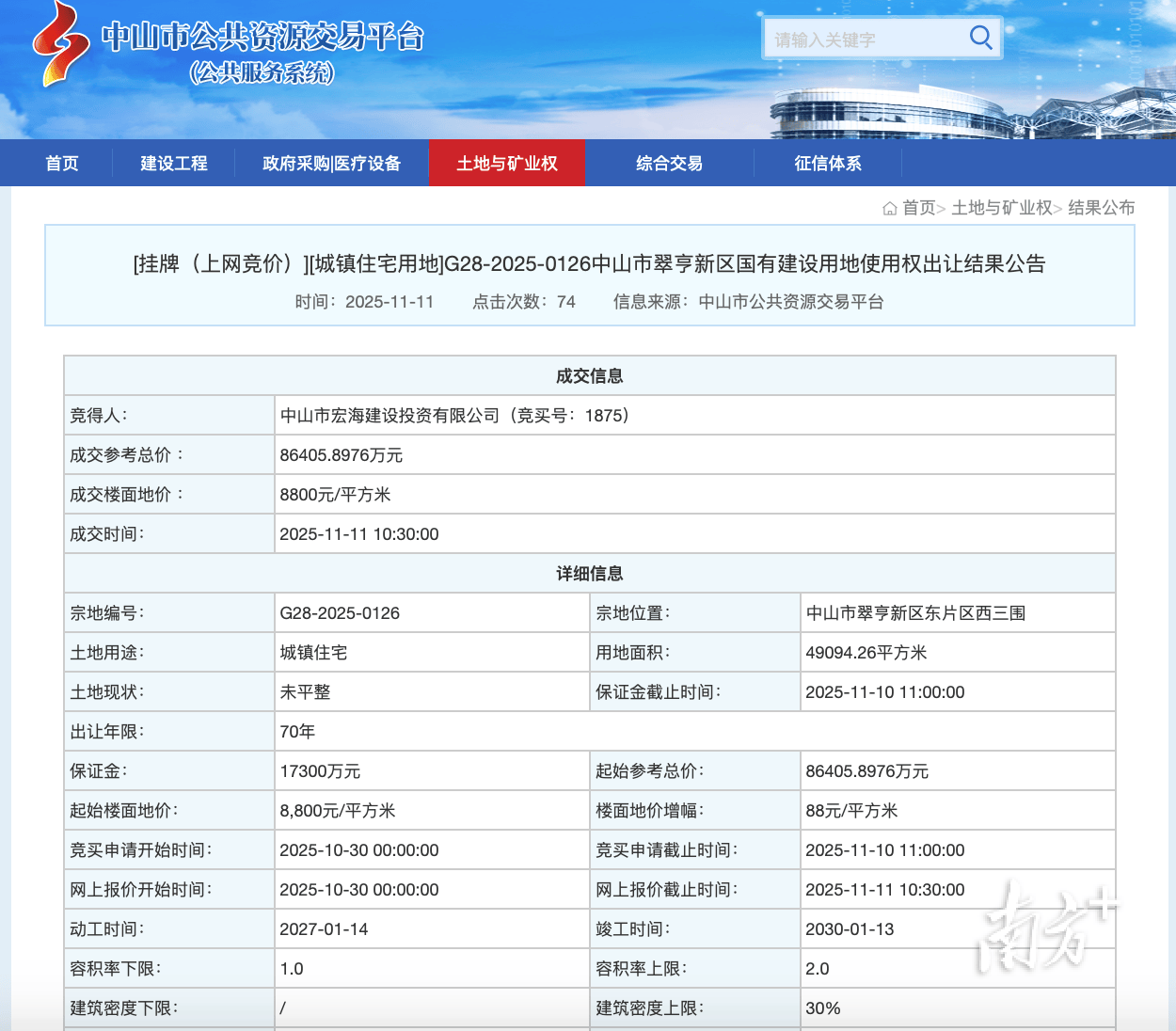 11月11日,中山市公共资源交易平台发布G28-2025-0126中山市翠亨新区国有建设用地使用权出让结果,中山翠亨集团有限公司所属企业中山市宏海建设投 资有限公司以86405.8976万元竞得。本次拍出的地块位于中山市翠亨新区马鞍岛西三围,出让年限为70年。根据公布地块信息,该用地将试点建设第四代住 宅(立体园林住宅)。 | | 成交信息 | | | | --- | --- | --- | --- | | 竞得人: | 中山市宏海建设投资有限公司 (竞买号: 1875) | | | | 成交参考总价: | 86405.8976万元 | | | | 成交楼面地价: | 8800元/平方米 | | | | 成交时间: | 2025-11-11 10:30:00 | | | | | 详细信息 | | | | 宗地编号: | G28-2025-0126 | 宗地位置: | 中山市翠亨新区东片区西三围 | | 土地用途: | 城镇住宅 | 用地面积: | 49094.26平方米 | | 未平整 土地现状: | | 保证等截止时间: | 2025-11-10 11:00:00 | | 出让年限: 70年 | | | | ...