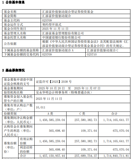 中国经济网北京11月12日讯今日,汇添富基金发布汇添富价值驱动混合型证券投资基金基金合同生效公 告。 | 基金名称 | 汇添富价值驱动混合型证券投资基金 | | --- | --- | | 基金简称 | 汇漆富价值驱动混合 | | 基金主代码 | 025709 | | 基金运作方式 | 契约型开放式 | | 基金合同生效日 | 2025年11月11日 | | 基金管理人名称 | 汇添富基金管理股份有限公司 | | 基金托管人名称 | 中国建设银行股份有限公司 | | 公告依据 | 根据《中华人民共和国证券投资基金法》及其配套法规和《汇 添富价值驱动混合型证券投资基金基金合同》的有关规定。 | | 下属基金份额的基金简称 | 汇漆富价值驱动混合 A 汇漆富价值驱动混合C | | 下属基金份额的交易代码 | 025709 025710 | | 基金募集申请获中国 | | 证监许可【2025】2038 号 | | --- | --- | --- | | 证监会核准的文号 | | | | 基金募集期间 | | 2025年10月20日 至 2025年11月07日 | | 验资机构名称 | | 安永华明会计师事务所(特殊 ...