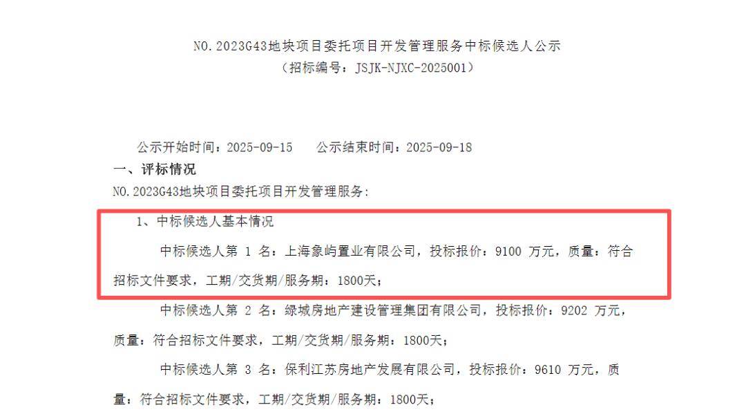 刚刚,燕子矶超级大盘代建方定了!由厦门国企 象屿地产开发管理! 近日,NO.2023G43地块项目委托项目开发管理服务中标候选人公示。公示显示,中标候选人第 1 名为 上海象屿置业有限公司, 投标报价为9100万元,质 量:符合招标文件要求,工期/交货期/服务期为1800天。 与此同时,象屿启动燕子矶G43地块人员的招聘,这也意味着项目或将很快上市。 地块西侧和燕路快速化已建成通车。西侧规划一处12班幼儿园,200米范围内已有仙林外校燕子矶校区、晓庄小学及伯乐中学,可充分满足片区教育配套 需求。地块西南侧为晓庄国际广场,所在片区北侧规划有商业综合体;北侧现有1处基层社区中心,可为周边居民提供便利的公共生活配套。地块周边生 态资源丰富,西侧紧邻幕府山风景区。 该项目的建设单位为南京星城房地产开发有限公司。此前有市场传闻称,该项目原计划由栖霞建设负责操盘。根据早期企业信息显示,栖霞建设确实曾持 有南京星城房地产开发有限公司20%的股权。但最新信息表明,栖霞建设后续可能调整了参与策略,其持股比例已被核实已从20%降至10%。 △南京星城房地产开发有限公司股东信息(截图日期:2024年8月) △南京星城房地产开发有限 ...