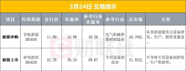 早报消费贷提额延期 央行再提择机降准降息 | | | | | 3月24日 交易提示 | | | | | --- | --- | --- | --- | --- | --- | --- | --- | | 项目 | 代码简称 | 发行价 | 市盈率 | 参考行业 市盈率 | 参考行业 | 总市值 | 主营 | | 新股申购 | 首航新能 301658 | 11. 80 | 15. 88 | 19. 26 | 电气机械和 器材制造业 | 43.79亿 | 从事新能源电力设备研 发、生产、销售及服务 | | | | | | | | | 0 | | 新股上市 | 矽电股份 301629 | 52. 28 | 26. 23 | 29. 67 | 专用设备制 造业 | 21.82亿 | 半导体专用设备的研发 、生产和销售。 | 宏观新闻 1、李强上周五主持召开国务院常务会议,研究建立健全涉企收费长效监管机制有关举措。会议指出, 要健全涉企收费目录清单制度,将所有收费项目均纳入清单并对社会公开,明确服务内容、服务标准、 收费额度,清单之外一律不得收费,依法依规对存量涉企收费政策进行清理。 2、中共中央政治局委员、国务院副总 ...