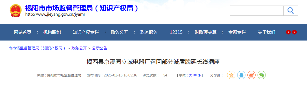 【广东】揭西县京溪园立诚电器厂召回部分诚盾牌延长线插座