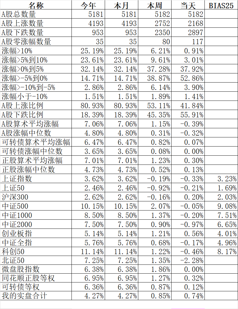 市场开始降温了,不仅指数涨跌各半,而且沪深两市的成交额从昨天的从昨天的39414亿一下子降低到今天的29055 亿,减少了1万亿多,不过这样也好,走成慢牛的概率反而大了。 | 名称 | 必生 | 本月 | 本周 | 当天 | BIAS25 | | --- | --- | --- | --- | --- | --- | | A股总数量 | 5181 | 5181 | 5182 | 5182 | | | A股上涨数量 | 4193 | 4193 | 2752 | 2168 | | | A股下跌数量 | 953 | 953 | 2350 | 2897 | | | A股零涨幅数量 | 35 | 35 | 80 | 117 | | | 涨幅>10% | 25. 19% | 25. 19% | 6.21% | 0. 91% | | | 涨幅>5%到10% | 23.61% | 23.61% | 9.61% | 3.01% | | | 涨幅>0%到5% | 32. 14% | 32. 14% | 37.28% | 37.92% | | | 涨幅>-5%到0% | 14.71% | 14.71% | 38. 87% | 52 ...