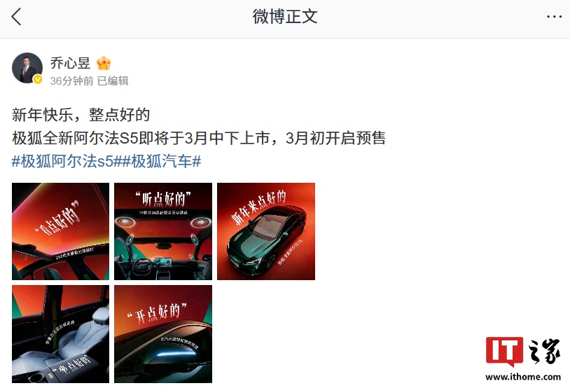 IT之家 2 月 24 日消息,北汽新能源极狐品牌用户运营中心副总经理乔心昱今日发文宣布,极狐全新阿尔法 S5 将于 3 月中下旬上市,3 月初开启预售。 乔心昱还公布了极狐全新阿尔法 S5 的部分亮点信息,包括:256 色天幕极光氛围灯、19 扬音响系统配合天空通道、零重力运动云绒座椅、北汽元境智能辅 助驾驶等。 256色天幕极光氛 "听点好的 19扬音响系统配合天空通道 72 6380 t 3 p ts 81 sp n o P (6 I og & 标 斯 RE READ 15:31 R Hillor f / THE UNE AND : : = i 97 R 互好的 66 北汽元境智能辅 IT之家注意到,全新极狐阿尔法 S5 官图已发布,新车定位"AI 高性能宽体轿跑",造型上延续现款车型,前包围进行了重新设计,更强调动感风格,并新增 了绿色车漆,预计仍旧采用双拼色设计。该车长宽高分别为 4886/1930/1480mm,轴距为 2900mm。 值得一提的是,该车还将提供增程版本(IT之家注:现款仅有纯电)。增程版搭载 1.5 升增程器,最大功率为 77kW,电机最大功率 200kW,匹配 27.4kWh ...