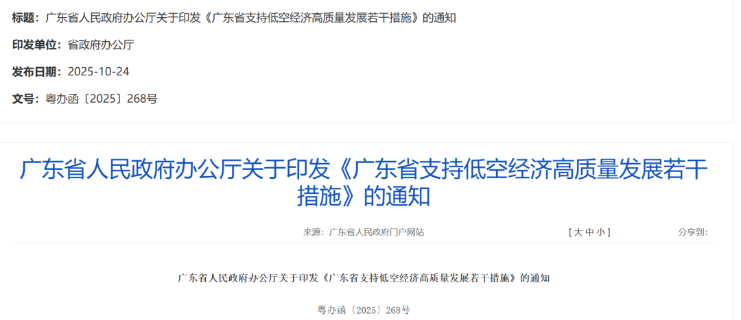 Core Viewpoint - The article discusses the recent policy measures introduced by the Guangdong Provincial Government to support the high-quality development of the low-altitude economy, aiming to establish Guangdong as a leading hub for this industry in China [1][2]. Policy Measures - The policy includes 16 specific measures to enhance low-altitude economic development, focusing on the release and efficient use of airspace resources, and the establishment of a comprehensive flight service platform [2][4]. - It emphasizes the importance of safety in low-altitude operations, including the integration of drone safety management into local emergency response systems [4]. Industry Growth Projections - The low-altitude economy in China is projected to reach a market size of 1.5 trillion yuan by 2025 and is expected to exceed 3.5 trillion yuan by 2035, indicating significant growth potential in this sector [1]. Financial Support and Innovation - The measures aim to enhance financial services for low-altitude enterprises, encouraging investment in key areas of the industry and providing support for companies seeking to go public [6][7]. - There is a focus on fostering innovation through the establishment of provincial-level innovation platforms and research centers in low-altitude technology [5]. Application Scenarios - The policy highlights various application scenarios for low-altitude services, including logistics and tourism, with specific support for cities like Guangzhou, Shenzhen, and Zhuhai to pilot low-altitude passenger routes [7][8]. - It encourages the use of low-altitude technologies in public services, such as emergency rescue and agricultural production, to expand the application of these technologies [7]. Tourism and Sports Development - The measures promote low-altitude tourism by supporting travel agencies in developing aerial tourism products and activities, as well as encouraging the establishment of flying camps and venues for aerial sports [8].