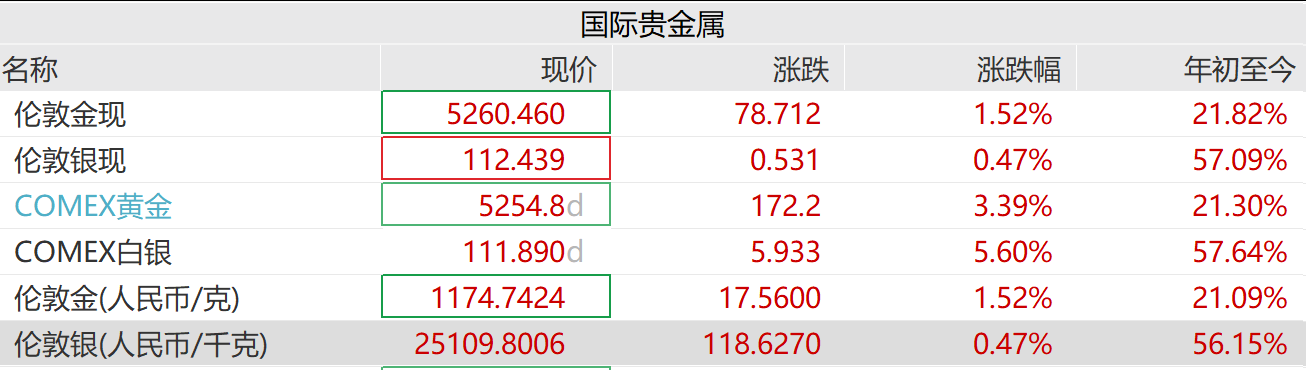 记者丨郭聪聪 编辑丨周炎炎 在本周一(1月26日)早盘突破每盎司5000美元心理关口后,现货黄金涨势不止。 截至1月28日20时左右,现货黄金报价报5260美元/盎司,单日涨幅1.52%,今日盘中更首次突破5300美元/盎司,再度刷新历史纪录。 | | 国际贵金属 | | | | --- | --- | --- | --- | | 名称 | 现价 | 涨跌 | 涨跌幅 | | 伦敦金现 | 5260.460 | 78.712 | 1.52% | | 伦敦银现 | 112.439 | 0.531 | 0.47% | | COMEX黄金 | 5254.8d | 172.2 | 3.39% | | COMEX白银 | 111.890d | 5.933 | 5.60% | | 伦敦金(人民币/克) | 1174.7424 | 17.5600 | 1.52% | | 伦敦银(人民币/千克) | 25109.8006 | 118.6270 | 0.47% | 图/AI 价格上涨的背后,是结构性的驱动力在发挥作用。长江商学院会计与金融学教授、投资研究中心主任刘劲分析指出,本轮黄金上涨折射出全球投资者对国际 政治经济环境高度 ...