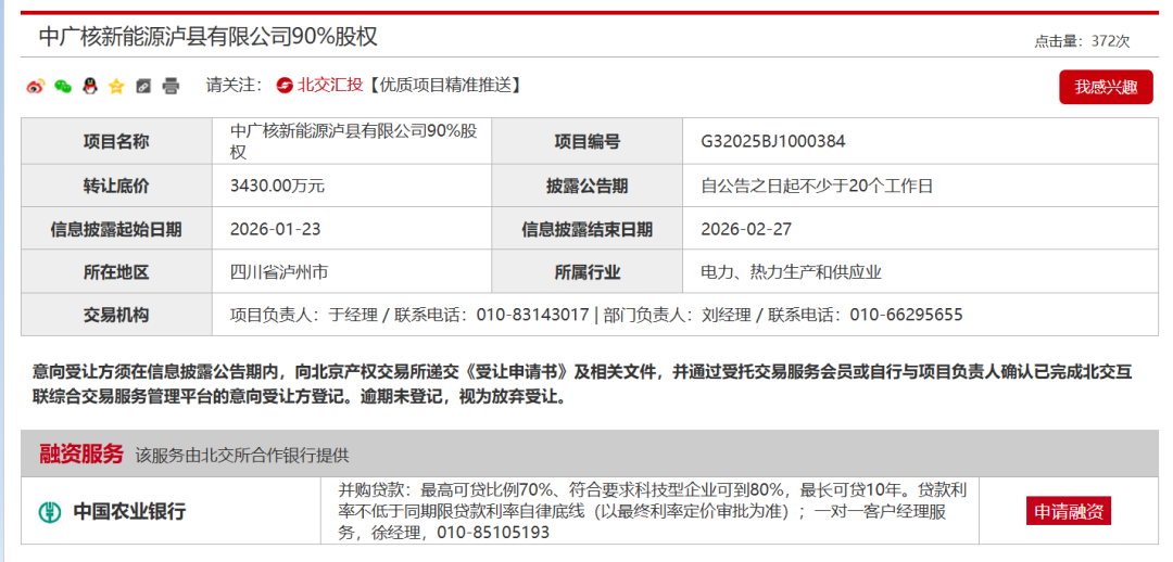 Core Viewpoint - Beijing Property Exchange has recently disclosed two equity transfer projects involving renewable energy companies under China General Nuclear Power Group (CGN) and China Southern Power Grid, indicating a growing interest in the renewable energy sector in China [1][6]. Group 1: Project Details - **Project One: CGN New Energy Luzhou Co., Ltd. 90% Equity** - Transferor: CGN Wind Power Co., Ltd. (regulated by the State-owned Assets Supervision and Administration Commission) [1][6] - Listing Price: 34.3 million yuan [1][6] - Disclosure Period: January 23, 2026, to February 27, 2026 [1][6] - Shareholders: CGN Wind Power Co., Ltd. (90%), Luzhou Jingyuan Energy Co., Ltd. (10%) [1][6] - Asset Scale: Established in 2022 with a registered capital of 45 million yuan (paid-in capital of 41.48 million yuan), focusing on photovoltaic and wind power clean energy business [1][6] - Special Terms: The acquirer must assume a debt of 7.9435 million yuan from the transferor and commit to not using the "CGN" brand; additionally, the remaining 3.3 million yuan of registered capital must be paid [1][6]. - **Project Two: China Southern Power Grid Comprehensive Energy (Hezhou) Co., Ltd. 51% Equity** - Transferor: China Southern Power Grid Comprehensive Energy Co., Ltd. [4][8] - Listing Price: 156.72189 million yuan [4][8] - Shareholders: China Southern Power Grid Comprehensive Energy Co., Ltd. (51%), China Resources Power New Energy Investment Co., Ltd. (49%) [4][8] - Asset Scale: Registered capital of 193.59183673 million yuan, with paid-in capital of 176.93877551 million yuan; the transferor has subscribed 98.73183673 million yuan and paid in 90.23877551 million yuan [4][8].