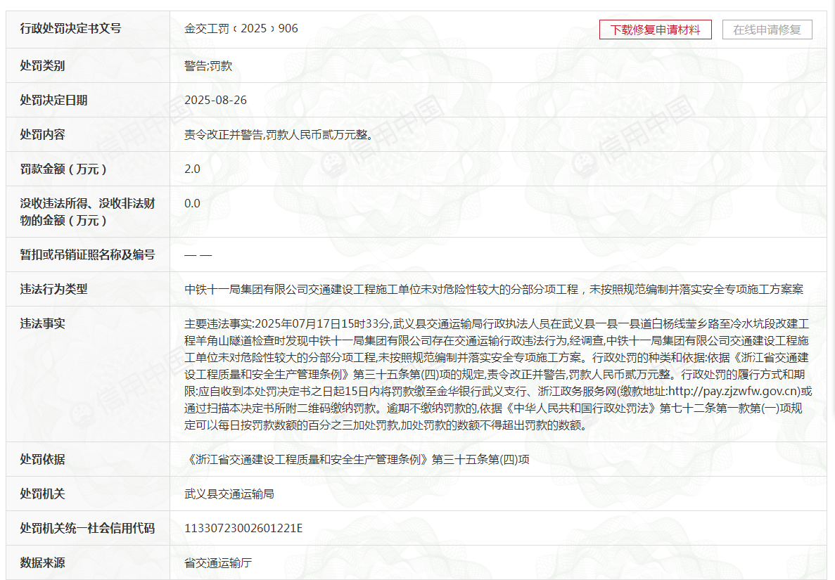 中铁十一局集团有限公司是世界500强企业--中国铁建股份有限公司旗下的骨干企业,集团公司总部位于湖北武汉。下辖50个全资子公司(国内47个、国外3 个)和161个分公司(境内151家,境外10家),13个国内区域指挥部,海外工程事业部以及投资公司、勘察设计院、襄阳管理部和财务共享服务中心。 新闻热线电话0531-85193242 | 行政处罚决定书文号 | 金交丁罚(2025)906 下载修复申请材料 在线申请 | | --- | --- | | 处罚类别 | 警告:罚款 | | 处罚决定日期 | 2025-08-26 | | 处罚内容 | 责令改正并警告,罚款人民币贰万元整。 | | 罚款金额(万元) | 2.0 | | 没收违法所得、没收非法财 物的金额(万元) | 0.0 | | 暂扣或吊销证照名称及编号 | --- | | 违法行为类型 违法事实 | 中铁十一局集团有限公司交通建设工程施工单位未对危险性较大的分部分项工程,未按照规范编制并落实安全专项施工 主要活法事实:2025年07月17日15时33分;武义县交通运输局行政执法人员在武义县一县一县道日杨线莹乡路至冷水坑群 | | | 程羊角山隧道检查 ...