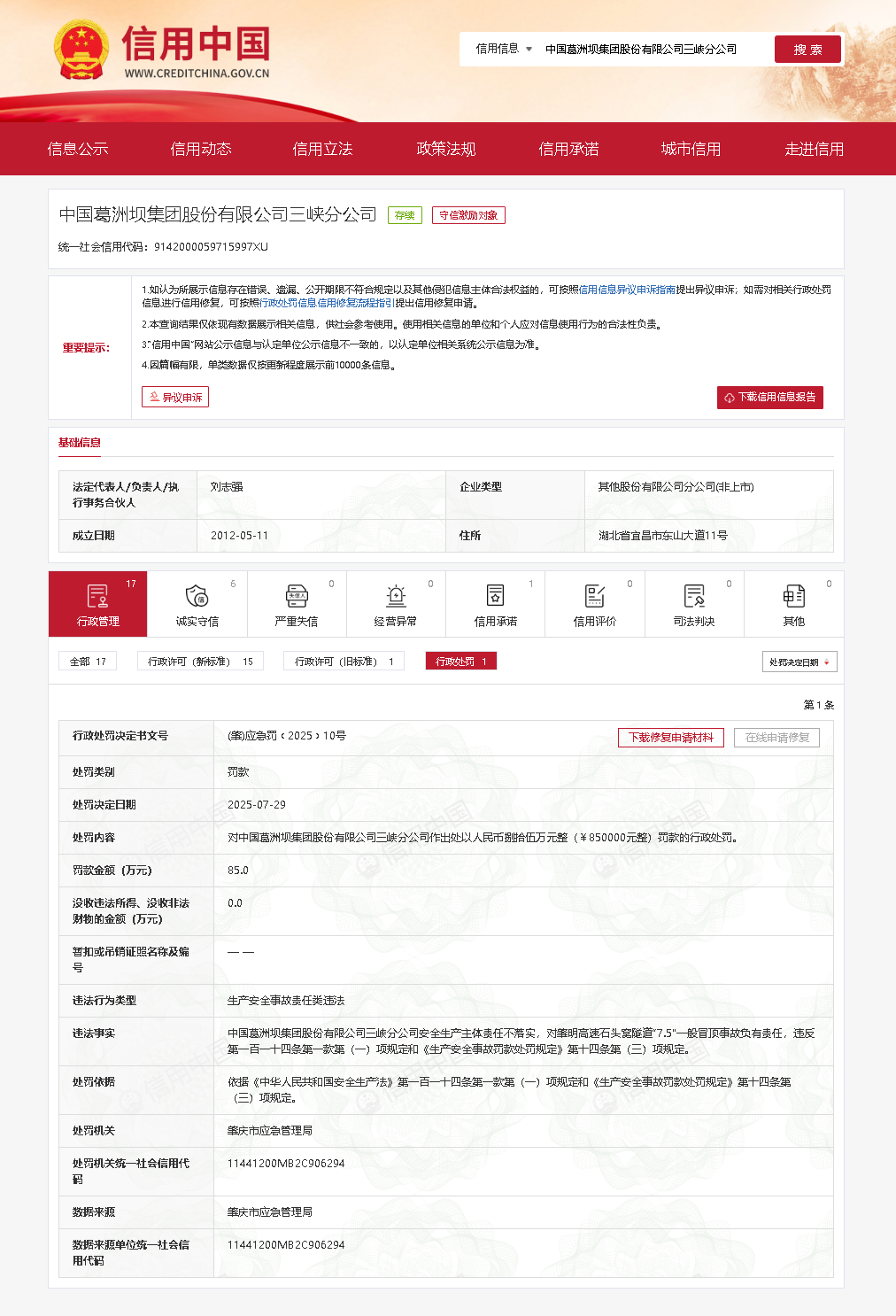 葛洲坝集团三峡分公司因生产安全事故类违法被罚85万