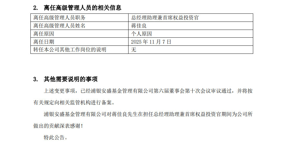 | 离任高级管理人员职务 | 总经理助理兼首席权益投资官 | | --- | --- | | 离任高级管理人员姓名 | 蒋佳良 | | 离任原因 | 个人原因 | | 离任日期 | 2025年11月7日 | | 转任本公司其他工作岗位的说明 | 元 | 浦银安盛基金再现人事调整。公司近日公告,总经理助理兼首席权益投资官蒋佳良因个人原因离任,离任日期为2025年11月7日。这是继2024年12月董事长 张健上任后,公司高管层的又一次重要变动。 Choice数据显示,截至2025年三季度末,浦银安盛公募资产净值约3419亿元,较2024年末下降逾10%,行业排名退至第30位,在银行系公募中降至第8位。 其中ETF规模不增反降,仅7.82亿元,不足2024年底的三分之一,成为公司表现最弱的业务板块。 蒋佳良离任,权益投研进入重组期 蒋佳良拥有丰富的金融履历,先后任职于法兰克福分行资金部、华宝证券和平安资管,2018年加入浦银安盛,历任研究部总监、均衡策略部总经理、基金经 理等职,2023年升任公司总经理助理兼首席权益投资官,成为浦银安盛权益投研的关键人物。 他的离任并非突发。9月29日,蒋佳良率先退出浦银安盛价值成 ...