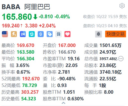 | BABA 阿里巴巴 | | | | --- | --- | --- | | 165.860 4 -0.810 -0.49% | | 收盘价 10/22 15:59 美东 | | 169.240 + 3.380 +2.04% | | 盘前价 10/23 04:10 美东 | | 三 5 24 4 5 8 9 月 0 | | ● 快捷交易 | | 最高价 169.670 | 开盘价 167.000 | 成交量 1501.65万 | | 最低价 163.580 | 昨收价 166.670 | 成交额 24.97亿 | | 平均价 166.304 | 市空率 19.16 | 总市值 3957.48亿( …) | | 振 幅 3.65% | 市盈率(静) 22.05 | 总股本 23.86亿 | | 换手率 0.67% | 市净率 2.781 | 流通值 3740.18亿 | | 52周最高 192.670 委 比 -90.48% | | 流通股 22.55亿 | | 52周最低 78.729 | 量 比 0.93 | 色 手 1股 | | 历史最高 303.257 股息TTM 1.051 | | 换股比率 8.0 ...