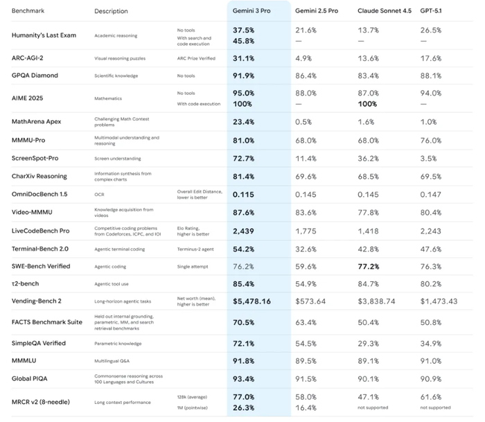 至少,要超出预期。至少,要给得更多。 美国时间11月18日凌晨,谷歌发布最新大模型Gemini 3,瞬间点燃公众对AI的关注,社交媒体上用 Gemini 3编程、开发应用的实测图不断刷屏,其实力被形容为"碾压级"。在大模型评估平台LMArena 中,Gemini 3 PRO一举登上榜首。连OpenAI的CEO萨姆·奥尔特曼都首次发出祝福。当然,全球首富、 xAI创始人马斯克也在发帖祝贺。 虽然新一代Gemini发布已经陆陆续续预热了一个多月,但外界对该模型似乎热情并没有那么高,至少比 不过今年8月OpenAI的GPT-5发布。 而11月初,谷歌CEO桑达尔・皮查伊在公司财报电话会议上谈及Gemini 3时也显得较为谨慎,他提到, 前沿大模型的开发需要更多时间,而Gemini 3预计不会让人们立刻就看到突破性的进展。 彼时多数媒体的报道,提及Gemini 3的预测口吻是"超越上一代模型,有望在与OpenAI的竞争中缩小差 距"。 恰恰是这种不算太高的预期,为这次Gemini 3"炸场"打下了基础。 根据Model Card上的测试数据,Gemini 3 Pro已在多个领域霸榜,实现了对GPT-5.1的全方位超越 ...