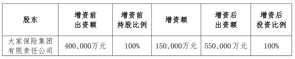 (中国保险行业协会) 1月6日,大家财险发布公告称,为支持改善资产结构,保持偿付能力充足,加快业务经营转型,公司拟增加注册资本15亿元。本次增资由现 股东大家保险集团有限责任公司以自有资金认缴,增资后公司注册资本将达到人民币55亿元,大家保险集团持股比例100%,保持不变。 | 股东 | 增资前 | 增资前 | 增资额 | 增资后 | 增资后 | | --- | --- | --- | --- | --- | --- | | | 出资额 | 持股比例 | | 出资额 | 投资比例 | | 大家保险集团 有限责任公司 | 400,000万元 | 100% | 150,000万元 | 550,000万元 | 100% | ...