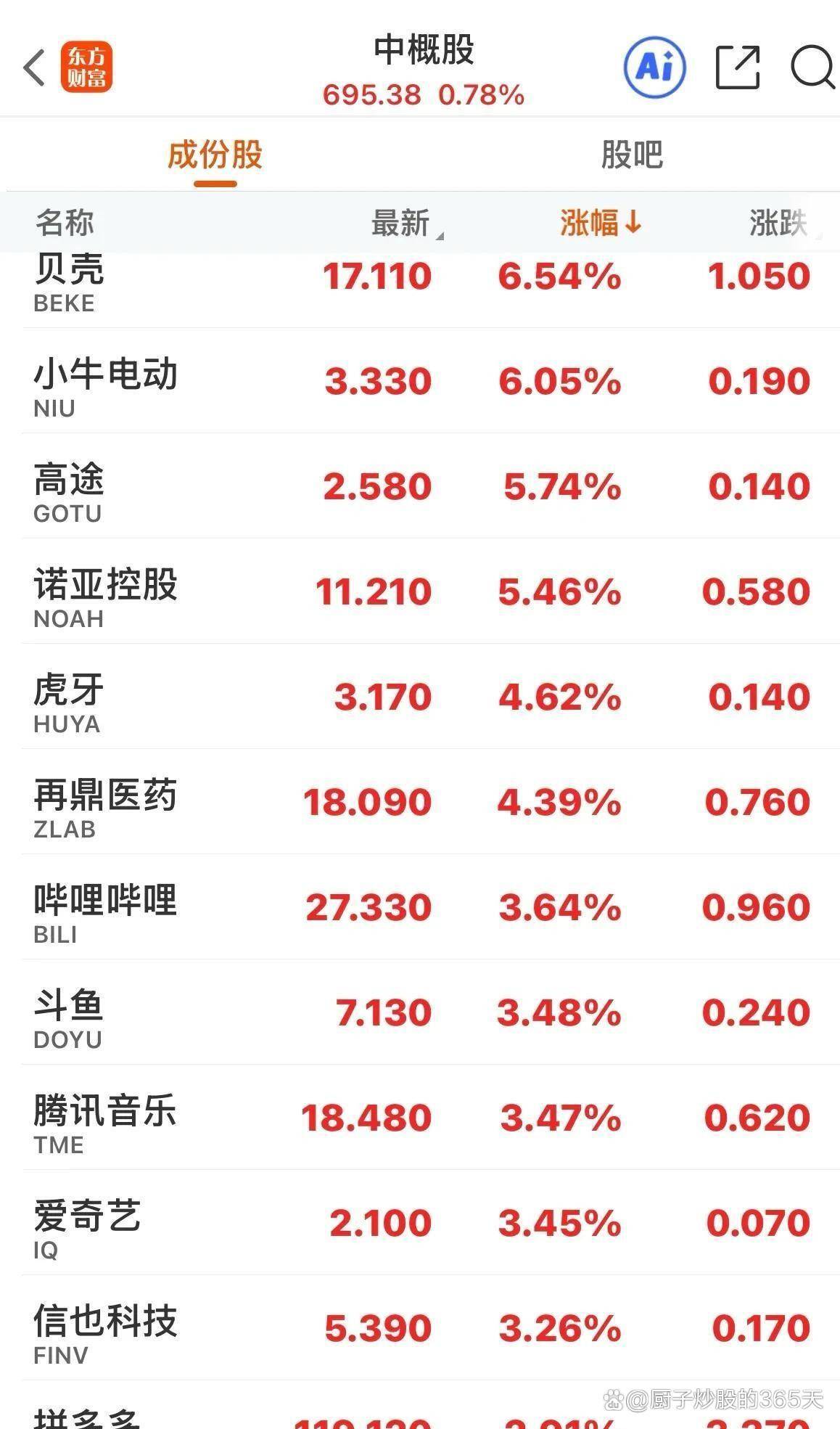 2026年1月6日清晨,当投资者打开行情软件时,历史正在屏幕上的K线图中静静流淌。 A股大盘已连续12个交易日收出阳线,追平了2006年和2008年创下的 纪录。 而这一天,市场期待着一项自1993年以来从未有过的成就——13连阳。 | 旅月 | 中概股 | | (Ai) 17 | | --- | --- | --- | --- | | | 695.38 0.78% | | | | 成份股 | | 股吧 | | | 名称 | 最新, | 涨幅↓ | 淵世 | | 贝壳 | 17.110 | 6.54% | 1.051 | | BEKE | | | | | 小牛电动 | 3.330 | 6.05% | 0.191 | | NIU | | | | | 高途 | 2.580 | 5.74% | 0.141 | | GOTU | | | | | 诺机场合报 | 11.210 | 5.46% | 0.58 | | NOAH | | | | | 虎牙 | 3.170 | 4.62% | 0.14( | | HUYA | | | | | 国鼎医药 | 18.090 | 4.39% | 0.76 | | ZLAB | | | ...