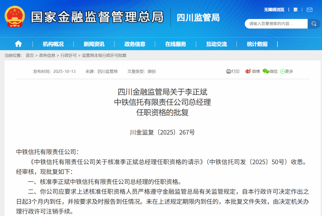 中铁信托新帅落定,副总经理李正斌“转正”