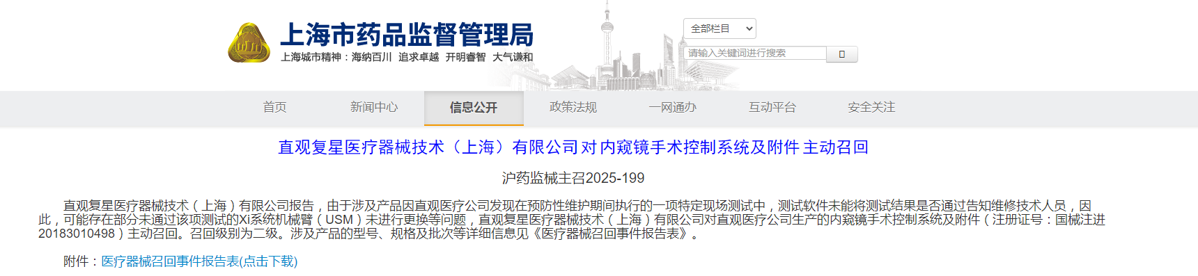 直观复星医疗器械技术(上海)有限公司对内窥镜手术控制系统及附件主动召回