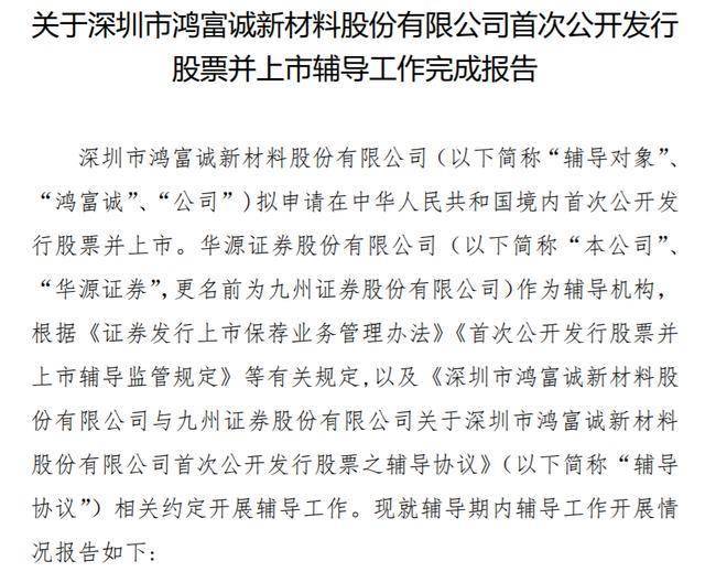 鸿富诚成立于2003年5月,是一家导热界面材料制造商,专注于创新材料的研发、制造与销售,主要产 品涵盖了屏蔽材料、导热界面材料、吸波材料等电子设备关键功能材料,可广泛应用于手机、平板电 脑、新能源汽车、网络通讯等领域。 据悉,2023年2月7日,华源证券与鸿富诚签署了辅导协议,并按照《首次公开发行股票并上市辅导监管 规定》等相关规定及双方约定开展辅导工作。自2023年2月7日至本报告出具日,鸿富诚共开展了十一期 辅导工作。 辅导报告显示,公司曾与部分股东签订的增资协议或股权转让协议中存在对赌条款及特殊权利条款。 瑞财经 王敏 11月28日,深圳市鸿富诚新材料股份有限公司(以下简称"鸿富诚")披露IPO辅导完成报 告,华源证券为辅导机构。 公司作为回购义务人涉及的对赌条款及股东特殊权利条款已基于各方签署的《股东协议之补充协议》终 止并自始无效,且《股东协议之补充协议》签署在财务报告出具日之前。其他不涉及公司作为义务人的 对赌条款及股东特殊权利条款在公司提交上市申报材料前一日终止。 | 大限章 | | 都在用的商业查询工具 | 道公司 童老板 童关系 查风险 | | | | --- | --- | --- | - ...