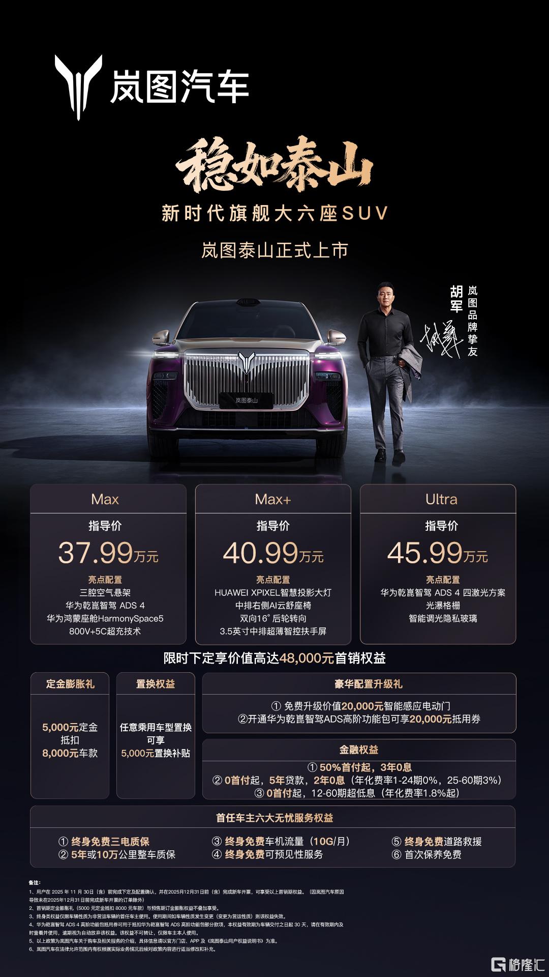 11月18日,岚图汽车在深圳国际会展中心召开以"争峰"为主题的新车发布会,正式发布新时代旗舰SUV——岚图泰山,新车共推出Max版、Max+版、Ultra 版、黑武士版四大版型,官方指导价为37.99万元-50.99万元。同时,还公布了总价值4.8万元的上市权益。 新时代旗舰大六座SUV 岚图泰山正式上市 Max 指导价 37.99 亮点配置 三腔空气悬架 华为乾崑智驾 ADS 4 华为鸿蒙座舱HarmonySpace5 800V+5C超充技术 Max+ 指导价 亮点配置 HUAWEI XPIXEL智慧投影大灯 中排右侧AI云舒座椅 双向16°后轮转向 3.5英寸中排超薄智控扶手屏 Ultra 指导价 亮点配置 华为乾崑智驾 ADS 4 四激光方案 光瀑格栅 智能调光隐私玻璃 限时下定享价值高达48,000元首销权益 | 定金膨胀礼 | 置换权益 | 豪华配置升级礼 | | --- | --- | --- | | 5,000元定金 | 任意乘用车型置换 | 1 免费升级价值20,000元智能感应电动门 2开通华为乾崑智驾ADS高阶功能包可享20,000元抵用券 | | 抵扣 | 可享 | | | 8,000元 ...