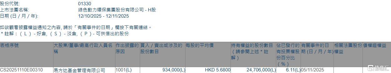 Group 1 - The core point of the article is that E Fund Management Co., Ltd. has increased its stake in Green Power Environmental (01330.HK) by purchasing 934,000 shares at an average price of HKD 5.68 per share, resulting in a total investment of approximately HKD 5.305 million [1] - Following this transaction, E Fund's total shareholding in Green Power Environmental has risen to 24.706 million shares, increasing its ownership percentage from 5.88% to 6.11% [1][2]