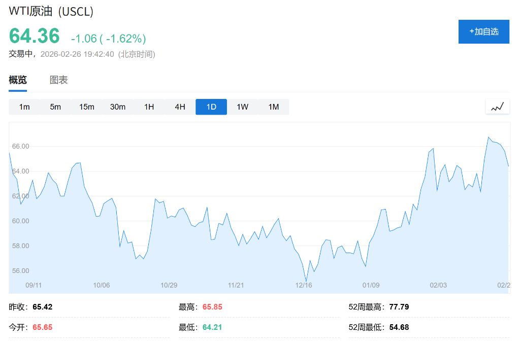 随着美伊第三轮核谈判在日内瓦重启,伊朗正加速通过霍尔木兹海峡输出原油,导致其"海上石油"储量创下历史新高。当前油价中已计入显著的 地缘政治风险溢价,但全球原油市场在中长期正面临深度的基本面重塑。 | 概览 | 图表 | | | | | | | | | | | | | --- | --- | --- | --- | --- | --- | --- | --- | --- | --- | --- | --- | --- | | 1m | 5m | 15m | 30m | 1H | 4H | 1D | 1W | 1M | | | | N | | 66.00 | | | | | | | | | | | | | | 64.00 | | | | | | | | | | | | | | 60.00 | | | | | | | | | | | | | | 58.00 | | | | | | | | | | | | | | 56.00 | | | | | | | | | | | | | | 09/11 | | 10/06 | | 10/29 | | | 11/21 | | 12/16 | 01/09 | 02/03 | 02/ ...