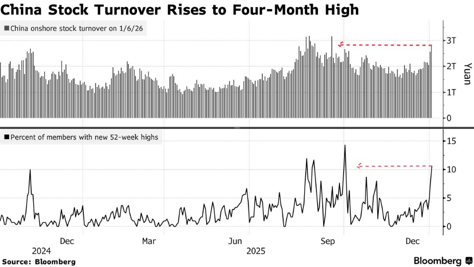 AI播客:换个方式听新闻 下载mp3 策略师们表示:"我们预测2026年股市上涨的动力,几乎完全来自企业盈利增长。"而盈利增长将"由人工智能、'出海'战略以及反内卷相 关政策提供支撑"。 A股单日成交额创4个月新高 高盛策略师预测,2026年内地投资者通过港股通净买入港股的规模有望达到2000亿美元,再创历史纪录。与此同时,海外投资者预计将 调整对中国股市的低配仓位,这或将为市场带来100亿美元的资金流入。 中国股市的上涨势头已强劲延续至新的一年。尽管中国股市2025年已经录得大幅上涨,但高盛仍与其他多家大型机构一道,维持对该市 场的积极展望。这一乐观判断,反映出市场对"盈利扩张、政策扶持、新增增长动能将持续吸引投资者入场"的信心。 2026年开年以来,沪深300指数已累计上涨3.5%,创下四年以来的最高水平;MSCI中国指数涨幅约3.6%,跑赢同期标普500指数。 市场交投热度也印证了投资者的高涨情绪:A股周二单日成交额飙升至2.8万亿元人民币(折合4010亿美元),不仅创下去年9月以来的新 高,还远超过去五年1.13万亿元的日均成交额。投资者融资融券余额同样徘徊在历史高点附近。当日沪深300指数上涨1.6 ...
