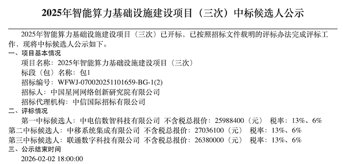 日前,中国星网公示2025年智能算力基础设施建设项目的中标候选人。中电信数智科技有限公司力压两 家竞争对手,排名第一。 本次招标吸引了中电信数智科技有限公司、中移系统集成有限公司、联通数字科技有限公司参与。最 终,中电信数智科技有限公司排名第一,报价2598.84万元(不含税,下同);中移系统集成有限公司 排名第二,报价为2703.61万元;联通数字科技有限公司排名第三,报价为2638万元。 日前,中国星网公示2025年智能算力基础设施建设项目的中标候选人。中电信数智科技有限公司力压两 家竞争对手,排名第一。 本次招标吸引了中电信数智科技有限公司、中移系统集成有限公司、联通数字科技有限公司参与。最 终,中电信数智科技有限公司排名第一,报价2598.84万元(不含税,下同);中移系统集成有限公司 排名第二,报价为2703.61万元;联通数字科技有限公司排名第三,报价为2638万元。 据C114了解,该项目此前已两次流标。 首次流标公告发布于2025年12月11日,中国星网明确流标原因是"至本项目投标文件递交截止时间,递 交投标文件的投标人数量不满足开标条件"。 此后2026年1月21日,中国星网发布2025年智 ...
