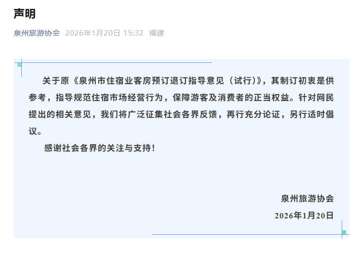 【文/观察者网 邓军 编辑/赵乾坤】 尽管泉州市旅游协会围绕"住宿业客房预订退订"出台的新规在争议声中暂告一段落,但此次短暂的尝试,仍为酒店行业带 来了新的启发与思考。 1月20日,泉州旅游协会发布声明:关于原《泉州市住宿业客房预订退订指导意见(试行)》(以下简称《指导意见》), 其制订初衷是供参考,指导规范住宿市场经营行为,保障游客及消费者的正当权益。针对网民提出的相关意见,我们将广 泛征集社会各界反馈,再行充分论证,另行适时倡议。 《指导意见》发布后,迅速在社交平台引发热议。 部分酒店经营者表示支持:"早该规范临时退订行为了,酒店空房损失很大""这是全国范围内的先行尝试,值得推广"。 也有网友认为:"(标准)过于严格,会影响旅游订房的便捷性""提前3天取消要扣80%房费,这简直是抢钱""会因此取消到 泉州旅游"。 泉州旅游协会 一个城市的酒店业包含多样的细分市场和产品,预订退订政策往往是酒店自主采用的销售策略,因此不同酒店的退订规则 存在一定的差异。 资深酒店收益管理专家、北京都季酒店管理公司总经理祖长生对观察者网表示,《指导意见》所设标准与当前住宿业市场 通行的做法存在较大出入。他建议,泉州市旅游协会在 ...