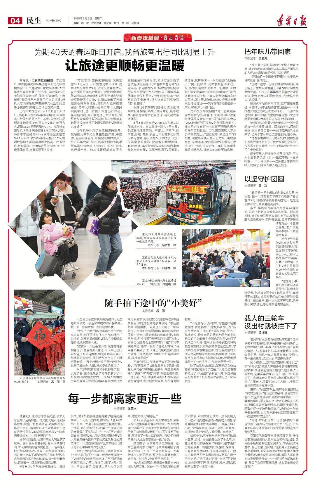 腰包鼓了,回家的脚步自然轻快。给家里置办的东北特产,他早早就寄回了湖南,此刻身上只有一个轻便的背包。列车行进在东北平原上,雷衍创心里竟 生出几分不舍:"过完年,我还得早点回来。" 与此形成对照的,是硬座车厢里47岁的湖北人郭万雷。过去一年,他在沈阳的生意不太顺利,可归家的心情却一点不比别人少。这回,他把往年坐的卧铺 换成了硬座,意味着要在嘈杂拥挤的车厢里,一直坐上18个小时,"硬座是累点,但省下来的几百块钱,正好给家里小女儿和父母多置办点年货。" 临近中午,列车长朱铁利穿过车厢,依次查票、巡视。他在铁路上跑了十几年,对春运的变化感触最深。"早些年,基本是打工的回乡潮。现在你看,旅 游的、探亲的,还有去南方过年的,选择越来越多了。"他说,"春运已不光是运送旅客,更是在运一份份念想。"为了保证这些"念想"平安抵达,他和同 事们早已把取暖、热水、药品这些事检查了一遍又一遍。 让旅途更顺畅更温暖 春运首日,中国铁路沈阳局集团有限公司沈阳站候车室节日气氛浓郁,欢歌笑语中,2026年铁路春运大幕正式开启。与此同时,在沈阳桃仙国际机场,伴 随"辽韵臻品 礼遇商旅"春运特色产品展示平台的搭建、候机大厅内音乐歌舞表演等文化活动 ...