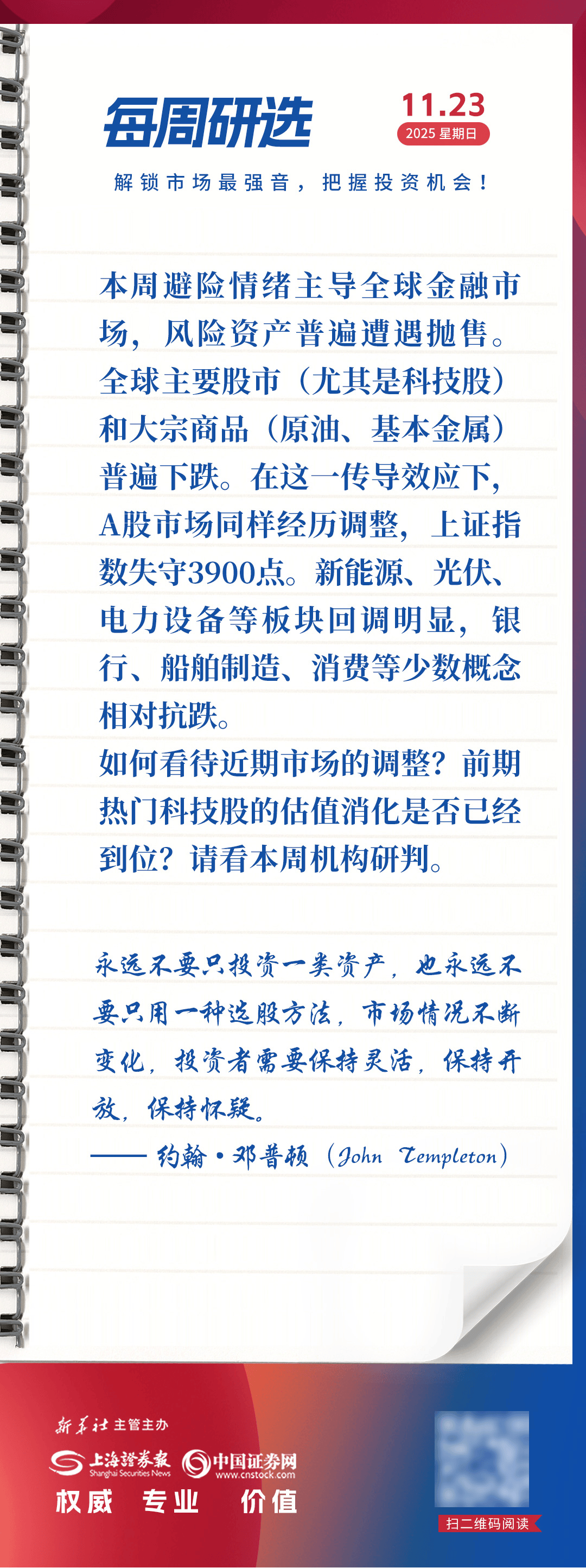 癌周研选 本周避险情绪主导全球金融市场,风险资产普遍遭遇抛售。全球主要股市(尤其是科技股)和大宗商品(原油、基本金属)普遍下跌。在这一传导效应 下,A股市场同样经历调整,上证指数失守3900点。新能源、光伏、电力设备等板块回调明显,银行、船舶制造、消费等少数概念相对抗跌。 11.23 2025 星期日 如何看待近期市场的调整?前期热门科技股的估值消化是否已经到位?请看本周机构研判。 解 锁 市场 最 强 音,把 握 投 资 机 会! 本周避险情绪主导全球金融市 场,风险资产普遍遭遇抛售。 全球主要股市(尤其是科技股) 和大宗商品(原油、基本金属) 普遍下跌。在这一传导效应下, A股市场同样经历调整,上证指 数失守3900点。新能源、光伏、 电力设备等板块回调明显,银 行、船舶制造、消费等少数概念 相对抗跌。 如何看待近期市场的调整?前期 热门科技股的估值消化是否已经 申万宏源:调整后春季行情更值得期待 9月以来AI产业链已处于高位震荡阶段。与此同时,近期美联储货币宽松低于预期,这进一步引发了全球高风险资产普跌。调整背后的本质还是资产性价 比降低,脆弱性提高,对流动性冲击的敏感度提升。对比2014年初的创业板、 ...