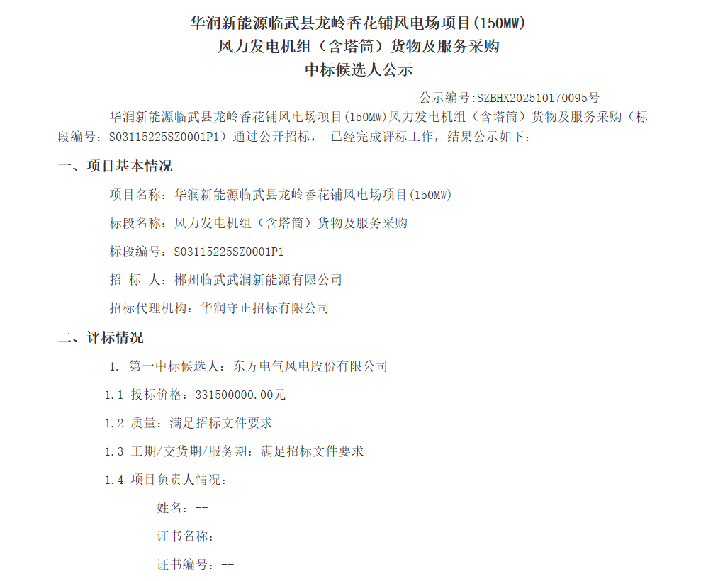 Core Viewpoint - The announcement reveals that the first candidate for the procurement of wind turbine generators (including towers) for the China Resources New Energy Linwu County Longling Xianghuapu Wind Farm Project (150MW) is Dongfang Electric, with a bid price of 331.5 million yuan, equivalent to 2,210 yuan/kW [2][5]. Group 1: Project Overview - The Linwu County Longling Xianghuapu Wind Farm Project has a total capacity of 150MW and will consist of no more than 24 turbine units, with an average unit area of at least 6.0 m²/kW [2][3]. - The maximum capacity per turbine unit is set at 6.25MW, and the tower type is a full steel rigid tower [2][3]. Group 2: Procurement Details - The procurement process was conducted through public bidding, and the evaluation has been completed [3][4]. - The first candidate, Dongfang Electric, has met all quality and service requirements as per the bidding documents [5]. - The second candidate is CRRC Zhuzhou Electric Locomotive Research Institute Co., Ltd., with a bid price of 334.2 million yuan [5].