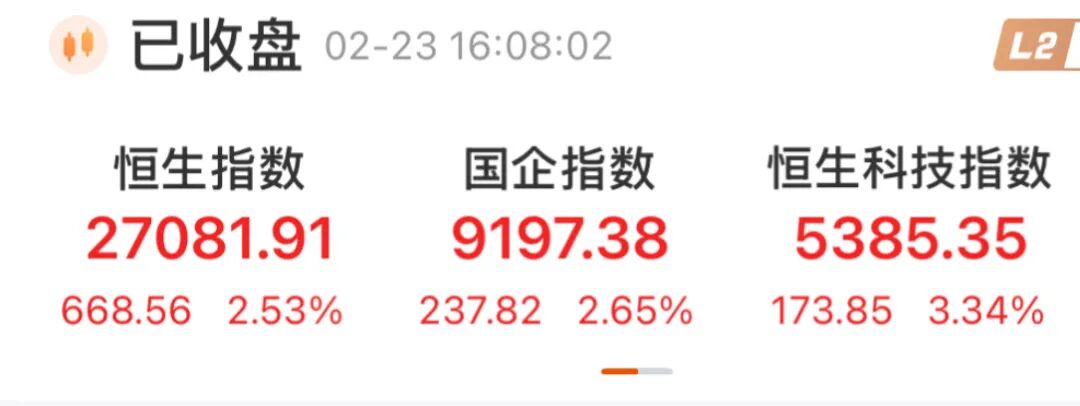 Market Overview - The Hong Kong stock market showed significant recovery on February 23, with all major indices closing higher, and the Hang Seng Index returning to the 27,000-point mark [1][2] - The Hang Seng Index rose by 2.53%, closing at 27,081.91 points, an increase of 668.56 points [2] - The Hang Seng Tech Index increased by 3.34% to 5,385.35 points, up by 173.85 points, while the National Enterprises Index rose by 2.65% to 9,197.38 points, gaining 237.82 points [2] Sector Performance - The market exhibited a broad-based rally, particularly in technology stocks, with Meituan rising by 5.26%, JD Group by 3.56%, Alibaba by 3.47%, Xiaomi by 3.39%, Baidu by 3.26%, Tencent by 3.07%, SenseTime by 2.97%, and NetEase by 1.73% [2] - Gold stocks also performed well, with Tongguan Gold increasing by 12.58%, Chifeng Jilong Gold by 7.96%, Zijin Mining International by 6.82%, Lingbao Gold by 6.23%, China National Gold by 6.14%, Zhaojin Mining by 5.83%, Zijin Mining by 5.35%, and Shandong Gold by 4.60% [2] Analyst Insights - Analysts noted that global stock markets are sensitive to interest rate trends, economic growth expectations, and industry-related news, with short-term volatility driven by technical and liquidity factors rather than fundamental changes [3] - The upcoming earnings season for listed companies is expected to provide stronger fundamental support for the market, with a focus on corporate earnings announcements and future development outlooks [3] - The technology sector, which has underperformed since early 2026, saw a collective rebound on February 23, with Meituan significantly boosting market sentiment [3]