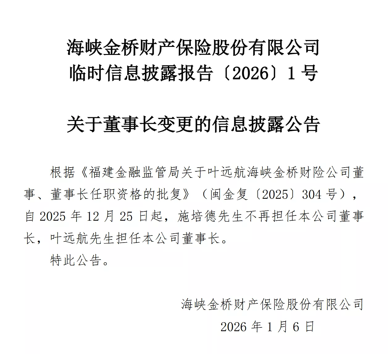 1月6日,海峡金桥财产保险股份有限公司发布公告称,根据《福建金融监管局关于叶远航海峡金桥财险公司董事、董事长任职资格的批复》(闽金复 〔2025〕304号),自2025年12月25日起,施培德不再担任公司董事长,叶远航担任公司董事长。 同日,另一则公告显示,经该公司董事会决议,自2025年12月25日起,施培德担任公司临时负责人,代行总裁职责。 关于指定临时负责人的信息披露公' 经本公司董事会决议,自2025年12月25日起 德先生担任本公司临时负责人,代行总裁职责。 特此公告。 海峡金桥财产保险股份有 2026年1月6日 海峡金桥财产保险股份有限公司 临时信息披露报告(2026)2号 ...
