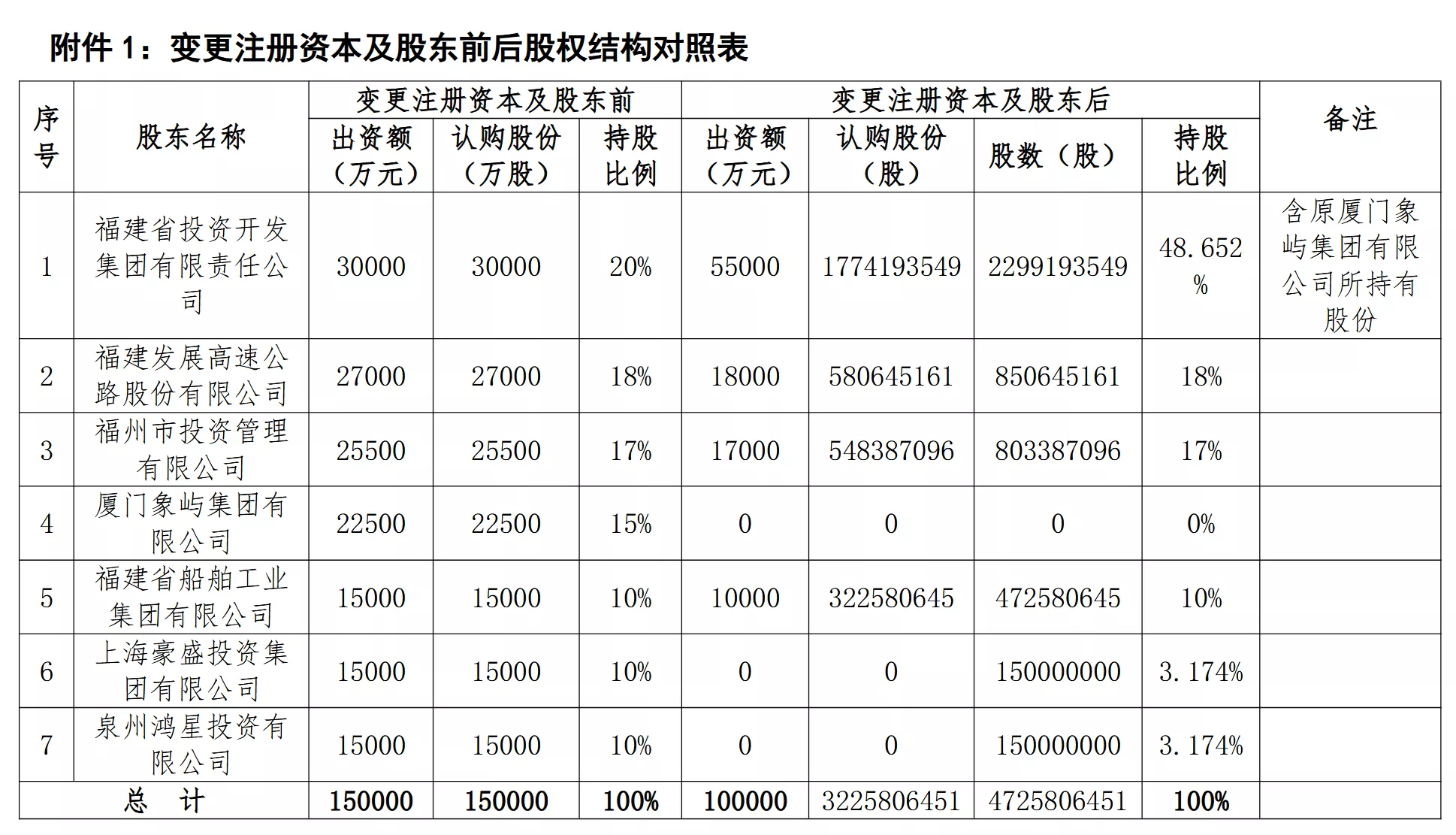 以上投资者认购公司股份的认购金额均计入公司注册资本,增资后注册资本变更为25亿元。本次增资后,公司已发行的全部股份均转换为无面额股。 公司股东厦门象屿(600057)集团有限公司拟将其所持有的全部公司股权(合计22500万股股份)以及由该股权而派生的所有权益,转让给公司股东福建省 投资开发集团有限责任公司。每股转让价格为0.31元,转让股权总价为6975万元。 | )স্ | 股东名称 | 出资额 | 变更注册资本及股东前 | | | | --- | --- | --- | --- | --- | --- | | 흥 | | | 认购股份 | 持股 | 出资额 | | | | (万元) | (万股) | 比例 | (万元) | | 1 | 福建省投资开发 集团有限责任公 | 30000 | 30000 | 20% | 55000 | | | ות | | | | | | 2 | 福建发展高速公 | 27000 | 27000 | 18% | 18000 | | | 路股份有限公司 | | | | | | 3 | 福州市投资管理 | 25500 | 25500 | 17% | 17000 | | | 有限公司 ...