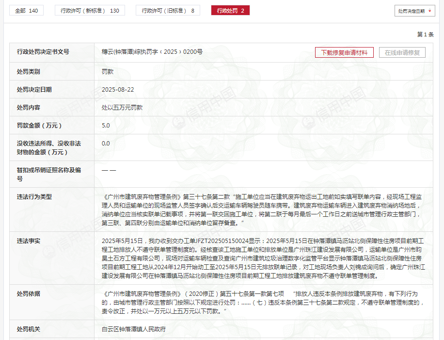 齐鲁晚报·齐鲁壹点记者于信用中国行政处罚栏获悉,8月22日,珠江实业集团旗下的广州珠江建设发展有限公司(下称"珠江建设公司")收行政处罚决定 书,处罚原因为"工地排放建筑废弃物不遵守联单管理制度"等。 | 全部 140 | 行政许可(新标准) 130 | 行政许可(日标准) 8 行政处罚 2 处罚决定日期 · | | | --- | --- | --- | --- | | | | | 第1条 | | 行政处罚决定书文号 | | 穗云(钟落酒)综执罚字(2025)0200号 下载修复申请材料 在线申请修复 | | | 处罚类别 | 罚款 | | | | 处罚决定日期 | 2025-08-22 | | | | 处罚内容 | 处以五万元罚款 | | | | 罚款金额(万元) | 5.0 | | | | 没收违法所得、没收非法 | 0.0 | | | | 财物的金额(万元) | | | | | 暂扣或吊销证照名称及编 | | | | | 름 | | | | | 违法行为英型 | | 《广州市建筑废弃物管理条例》第三十七条第二款"施工单位应当在建筑废弃物运出丁地前如实填写联单内容,经现场工程监 | | | | | 理人 ...