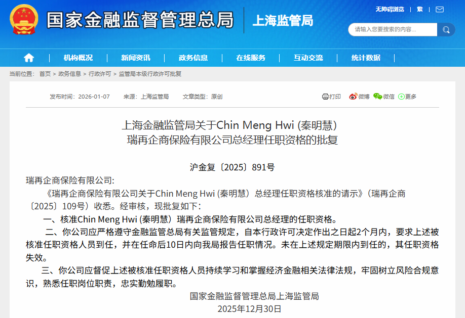 关键词阅读:瑞再企商 总经理 责任编辑:钟离 1月7日,上海金融监管局发布行政许可信息,Chin Meng Hwi (秦明慧)获批担任瑞再企商总经理。 瑞再企商官网显示,秦明慧于2015年8月至2025年7月期间,在Swiss Re Corporate Solutions担任亚太地区首席财务官,她曾于安联 保险新加坡和慕尼黑分别任职负责财务方面的工作。于2025年8月加入瑞再企商担任临时总经理。 ...