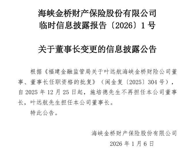 1月6日,海峡金桥财险发布公告称,根据《福建金融监管局关于叶远航海峡金桥财险公司董 事、董事 长任职资格的批复》(闽金复〔2025〕304号), 自2025年12月25日起,施培德不再担任公司董事长, 叶远航担任公司董事长。此外,经公司董事会决议,自2025年12月25日起,施培德担任公司临时负责 人,代行总裁职责。 公开资料显示,叶远航,1976年10月出生,现任福建投资集团党委委员、副总经理,曾任人保财险福州 市分公司党委委员、副总经理;人保财险福建省分公司党委委员、总经理助理、副总经理等职。施培 德,1971年9月出生,2021年1月起担任海峡金桥财险党委书记,1992-2021年服务于人保系统,曾任人 保财险厦门市分公司党委书记、总经理等职务。 ...