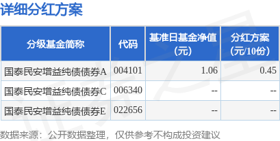 证券之星消息,11月11日发布《国泰民安增益纯债债券型证券投资基金A类份额分红公告》。本次分红 为2025年度第二次分红。公告显示,本次分红的收益分配基准日为11月11日,详细分红方案如下: 本次分红对象为权益登记日在注册登记机构登记在册的本基金 A 类份额全体基金份额持有人,权益登 记日为11月12日,现金红利发放日为11月13日。选择红利再投资方式的投资者,其红利将按照2025年11 月12日除息后的基金份额净值为计算基准确定再投资份额。本基金管理人对红利再投资所确定的基金份 额于2025年11月13日直接计入其基金账户,2025年11月14日起投资者可以查询、赎回。根据财政部、国 家税务总局的财税字【2002】128号《关于开放式证券投资基金有关税收问题的通知》,投资者(包括个 人和机构投资者)从基金利润分配中取得的收入,暂不征收个人所得税和企业所得税。本基金本次分红 免收分红手续费。 以上内容为证券之星据公开信息整理,由AI算法生成(网信算备310104345710301240019号),不构成 投资建议。 | 分级基金简称 | 代码 | 墓准日基金净值 | | 分红方案 | | --- | --- ...