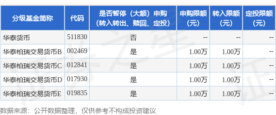 证券之星消息,11月11日华泰柏瑞基金管理有限公司发布《华泰柏瑞交易型货币市场基金B类基金份 额、C类基金份额、D类基金份额和E类基金份额调整机构投资者大额申购及大额转换转入业务金额限制 的公告》。公告中提示,为保证基金的平稳运作,维护基金持有人利益,自2025年11月12日起华泰柏瑞 交易型货币市场基金B类基金份额、C类基金份额、D类基金份额和E类基金份额调整机构投资者大额申 购及大额转换转入业务金额限制,申购、转换转入上限金额为1.0万元,下属分级基金调整明细如下: | 分级基金简称 | 代码 | 是否暂停(大额)申购 | 申购限额 | 转入限额 定投限额 | | | --- | --- | --- | --- | --- | --- | | | | (转入转出、赎回、定投) | (元) | (元) | (元) | | 华泰华币 | 511830 | KO | | | | | 华泰柏瑞交易货币B 002469 | | 를 | 1.00万 | 1.00万 | | | 华泰柏瑞交易货币C 012841 | | 를 | 1.00万 | 1.00万 | | | 华泰柏瑞交易货币D 017930 | | 른 | 1 ...